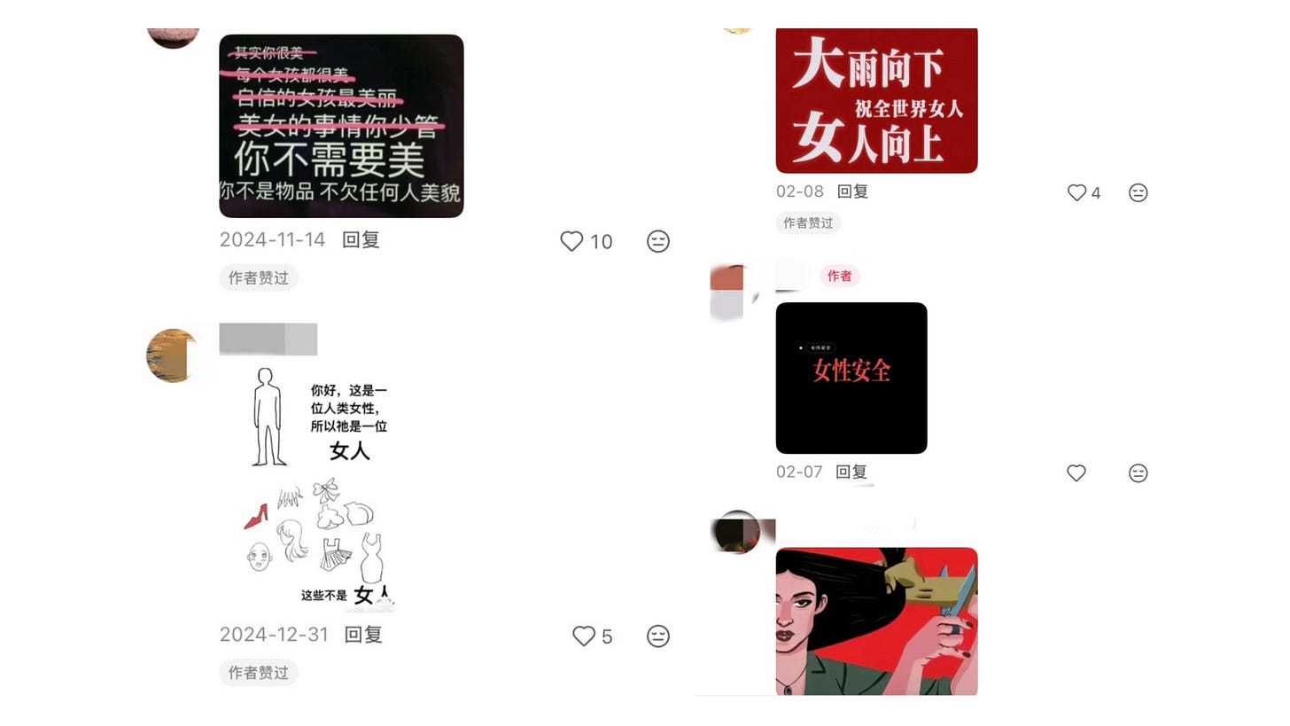 虎嗅网今年3月发布的文章《小红书上的女性主义与父权制:一场无声的较量》,将小红书的女性意识表达称作“奶茶杯底”的“微型宣言”。这也似乎符合香港中文大学文化研究学者谭佳提出的女权主义的“缓慢抵抗”概念:非自由环境下分散、小规模但持续的抵抗实践,很多时候表现为日常行为,易被忽视,但仍可能对社会变革起积极作用。这一概念回应了在中国女权行动被打压的同时,社交媒体上女权主义话语和身份却空前流行的现象。