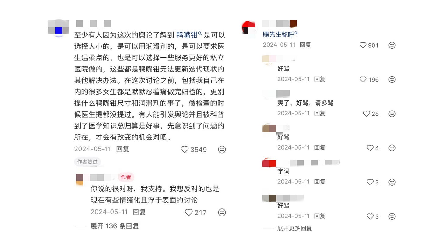2024年5月,网上掀起一波女性对妇科检查中粗暴使用鸭嘴钳的抗议。王琪琦对抗议本身进行了反思:“舆论真的能推动器械改进吗?我对此持消极态度。”她的本意是想指出人们对于医疗系统的迷思,希望舆论不只停留在“个人经验性的表达”带来的情感宣泄上。帖文获得了500余条评论,不过其中包含许多对她“居高临下”“理中客”的批评,更有人讽刺地将她称作“先生”,意为“精神男人”。