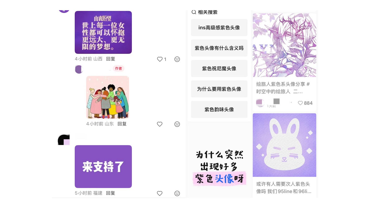 今年10月至11月期间,中国社交媒体上的一些网友响应了海外的“紫色头像运动”——通过将头像改为紫色,声援南非女权组织要求政府将针对女性的暴力及谋杀宣布为国家灾难的紧急呼吁。在小红书,除了有网友自己更换头像,还有人提供紫色模板,或义务帮助希望保留原有头像的网友调色,也出现了专为追星或喜欢虚拟角色的网友提供的头像。此外还有更多围绕“紫色”这一关键词展开的内容,如“好物推荐”:从讲述美国黑人女性反抗性别压迫的小说《紫颜色》,到紫色调的时尚单品。